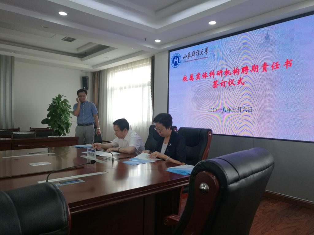王邵军分别与经济研究中心、区域经济研究院、农业与农村经济研究中心、政府绩效评价研究中心、人才发展研究中心、山东金融发展研究院等六个校属实体科研机构负责人签订了任期目标责任书。